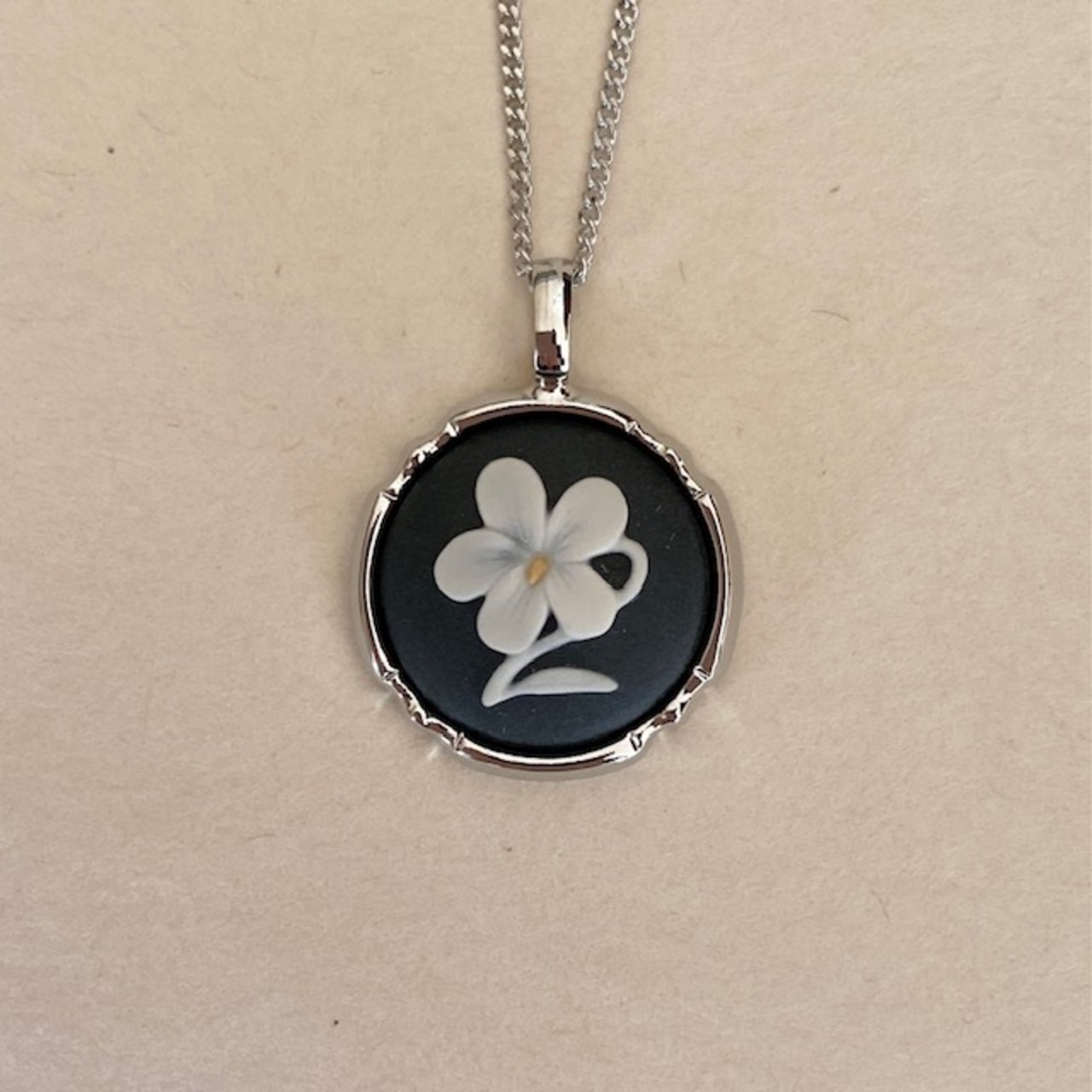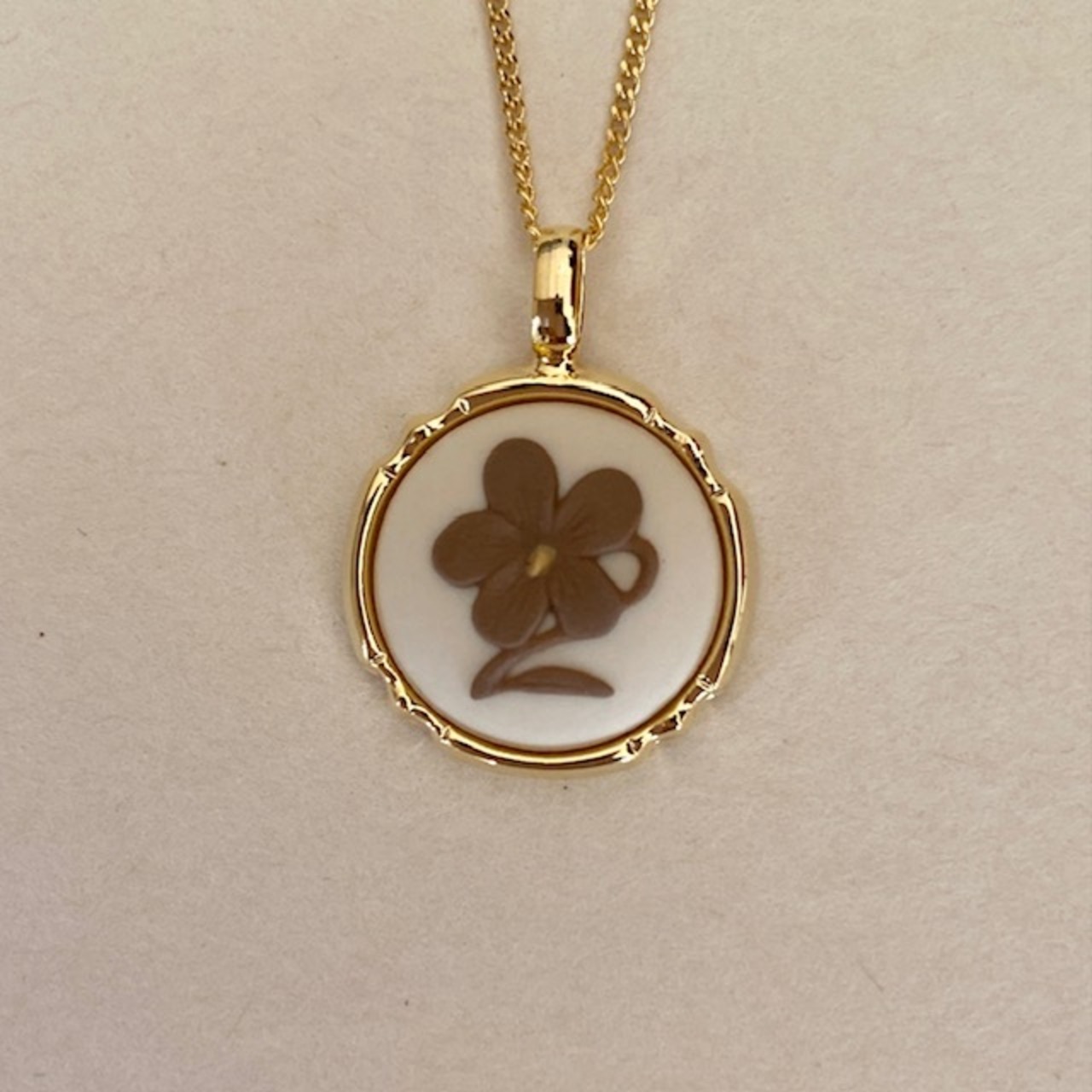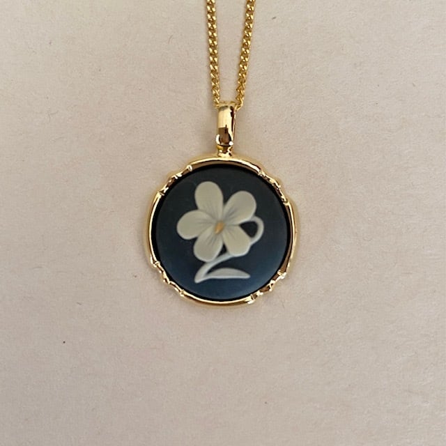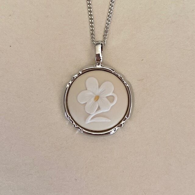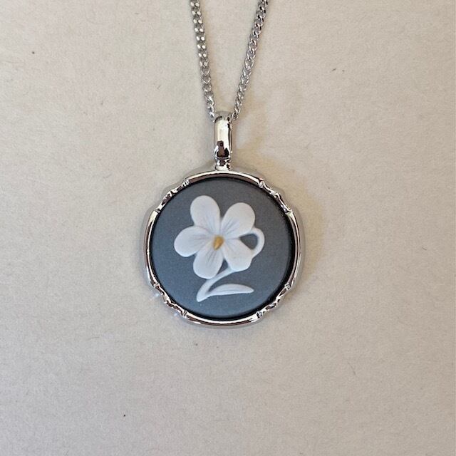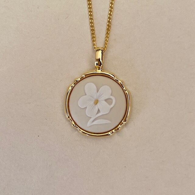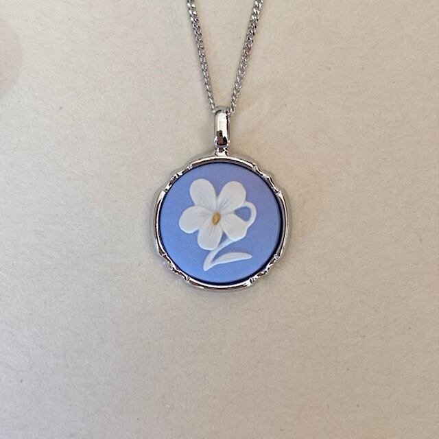 ラウンド花スミレペンダントは、淡い色合いの可憐なスミレをモチーフにした陶磁器カメオのペンダントです。花芯には黄色が施され、三色レリーフのデザインが美しい一品。
